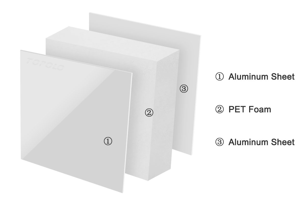 - 高強度:PETフォームコアは優れた圧縮強度とせん断強度を提供し、両側のアルミニウムスキンと中央のPETフォームコアで構成されるサンドイッチ構造により、パネルに高い全体的な強度が与えられます。