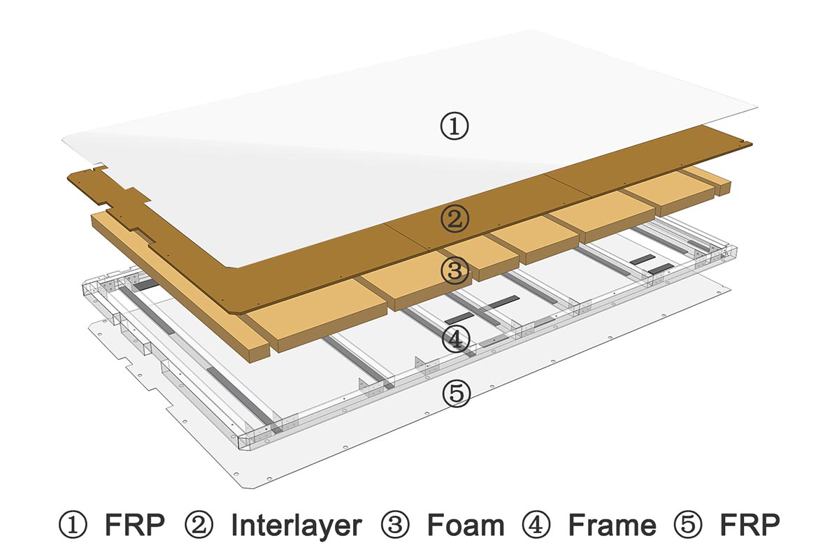 - 表層は防水FRPで、車両底部からの湿気が箱内に浸透するのを防ぎます。