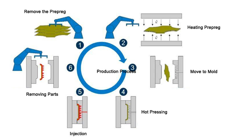 - 炭素繊維と熱可塑性樹脂(ポリプロピレン、ポリエチレン、ポリアミドなど)の複合シートを加圧下で所望の形状に成形して大量生産するため、金属バンパーの製造に比べて製造コストが大幅に削減されます。